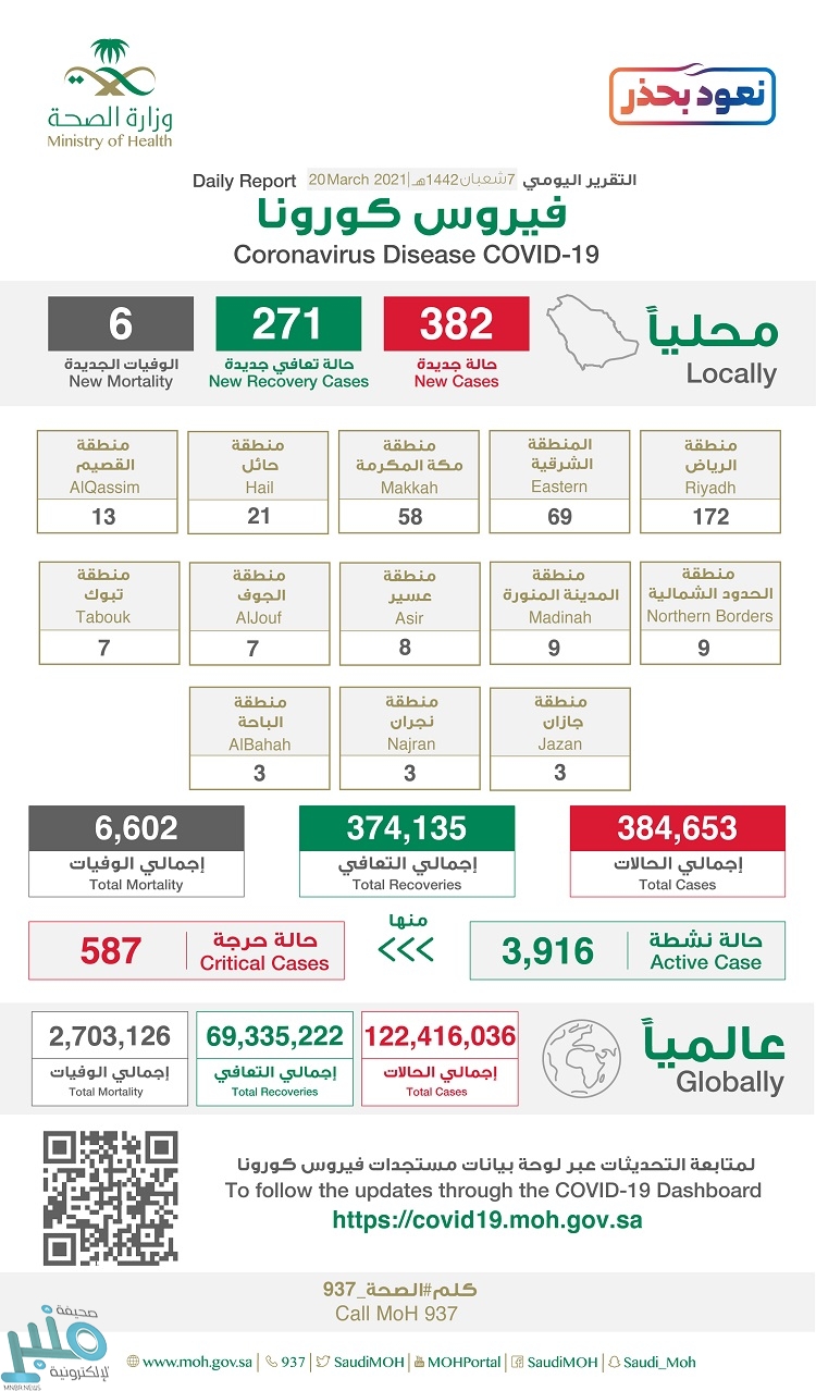 أعلنت وزارة الصحة، اليوم السبت ، عن تسجيل 382 إصابة جديدة بفيروس “كورونا”، و 6 حالات وفاة ، و 271 حالة تعافي .