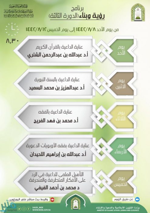 تطلق وزارة الشؤون الإسلامية والدعوة والإرشاد، مساء اليوم الأحد، برنامج “رؤية وبناء” الثالث، والذي يستمر لمدة خمسة أيام، بمشاركة 300 من الدعاة الرسميين بمختلف مناطق ومحافظات المملكة، عبر ندوات ومحاضرات ولقاءات علمية متخصصة يلقيها نخبة من المختصين في الدعوة عبر تطبيق زووم.