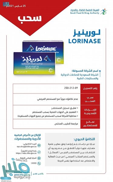 أصدرت الهيئة العامة للغذاء والدواء قرارا بتعليق تسجيل وسحب مستحضر( LORA S Tablet) المسجل بالهيئة برقم (8-968-15) ومستحضر (LORINASE TABLETS) المسجل بالهيئة برقم