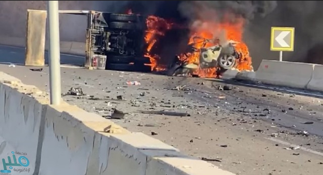 والتقط أحد المواطنين اللقطات المصورة من داخل سيارته، لسيارة تسير عكس الاتجاه بسرعة جنونية متجاوزة السيارات التي تقابلها حتى اصطدمت بقوة بإحدى سيارات النقل، ما أدى إلى انفجارها واشتعال النيران فيها على الفور.
