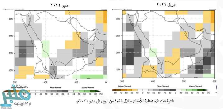 وفيما يتعلق بالتوقعات الشهرية للأمطار خلال شهر رمضان تشير التوقعات الاحتمالية بمشيئة الله تعالى إلى هطول الأمطار بأعلى من المعدل على منطقة مكة المكرمة “مكة المكرمة، جدة، الطائف” وحول المعدل على أغلب مناطق المملكة.