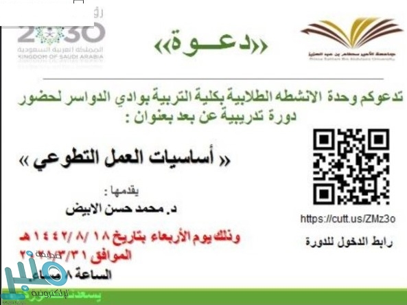أقامت كلية التربية في محافظة وادي الدواسر، يوم أمس دورة تدريبية في “أساسيات العمل التطوعي” عبر برنامج البلاك بورد، قدمها أستاذ الصحة النفسية المساعد بالكلية الدكتور محمد حسن الأبيض.