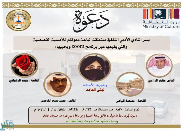 يستضيف النادي الأدبي الثقافي بمنطقة الباحة الأحد القادم ٢٢-٨-١٤٤٢هـ عدد من نجوم القصة في أمسية قصصية، يشارك فيها القاص طاهر الزارعي والقاصة مسعدة اليامي والقاص حسين صبح الغامدي والقاصة مريم الزهراني، وتدُيرالأمسية الاستاذة ليلى الحامد.