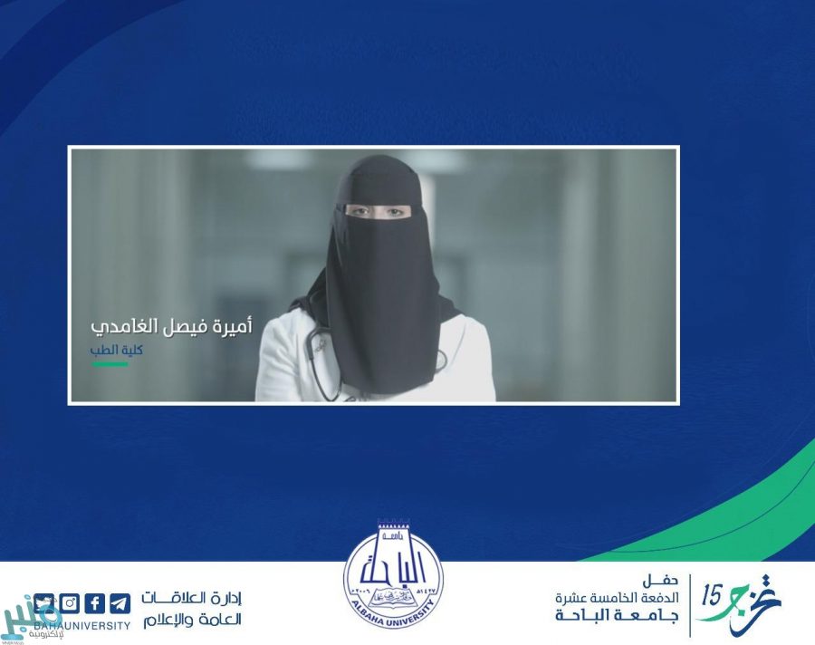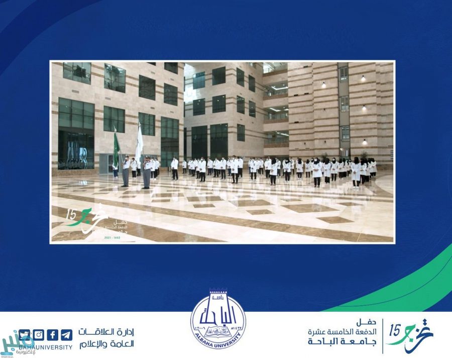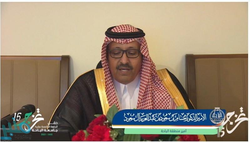 رعى صاحب السّمو الملكي الأمير الدكتور حسام بن سعود بن عبدالعزيز أمير منطقة الباحة، عن بعد، اليوم الأربعاء، حفل جامعة الباحة السنوي “الافتراضي” لتخريج الدفعة الخامسة عشرة من طلابها وطالباتها للعام الجامعي1441- 1442هـ، البالغ عددهم أكثر من 4340 خريجًا وخريجة في جميع التخصصات والبرامج الطبية، والعلميّة، والنظريّة وذلك عبر الاتصال المرئي من خلال منظومة التعلم الإلكتروني رافد.