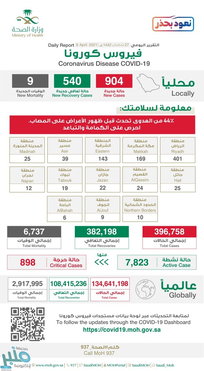 وأضافت الصحة أن إجمالي حالات المصابين في المملكة وصل إلى 396758 حالة حتى الآن ، ووصل مجموع المتعافين إلى 382198 حالة ، فيما بلغ إجمالي الوفيات 6737 حالة وفاة .