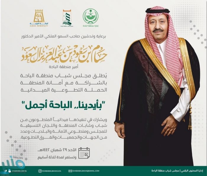 بتوجيه ورعاية كريمة من صاحب السمو الملكي الأمير الدكتور حسام بن سعود بن عبدالعزيز أمير منطقة الباحة، يدشن سموه، يوم الأحد القادم، الحملة التطوعية الميدانية تحت شعار “بأيدينا..الباحة أجمل”، والتي تستهدف المنتزهات والحدائق في منطقة الباحة وجميع محافظاتها، بتنظيم مجلس شباب منطقة الباحة ولجانه التنسيقية بالمحافظات بالشراكة مع أمانة المنطقة وبلدياتها.