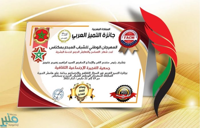 فازت جمعية الفجيرة الاجتماعية الثقافية بجائزة التميز العربي في المجال الثقافي الاجتماعي، وذلك ضمن جوائز الدورة الثالثة من “المهرجان الوطني للشباب المبدع 2021” الذي ينظمه منتدى الفن والإبداع المغربي في مدينة مكناس بالمملكة المغربية، تحت شعار: “التسامح والتعايش الديني لخدمة البشرية”.