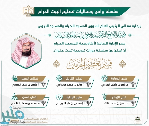 ضمن سلسلة برامج وفعاليات (تعظيم البيت الحرام) قامت الإدارة العامة لأكاديمية المسجد الحرام ممثلة في أكاديمية خدمات الحجاج والمعتمرين، بإطلاق عدد من الدورات التدريبية تحت عنوان قِيَمُ تَعْظِيْمِ الحَرَمَين، أوضح ذلك سعادة مدير الإدارة العامة لأكاديمية المسجد الحرام الأستاذ أحمد بن عيد الوذيناني.