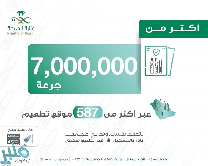 أعلنت وزارة الصحة، اليوم الأحد، أن أكثر من (7,000,000) جرعة من لقاح كورونا (كوفيد-19) تم إعطائها حتى الآن عبر أكثر من (587) موقع للتطعيم في كافة مناطق المملكة.