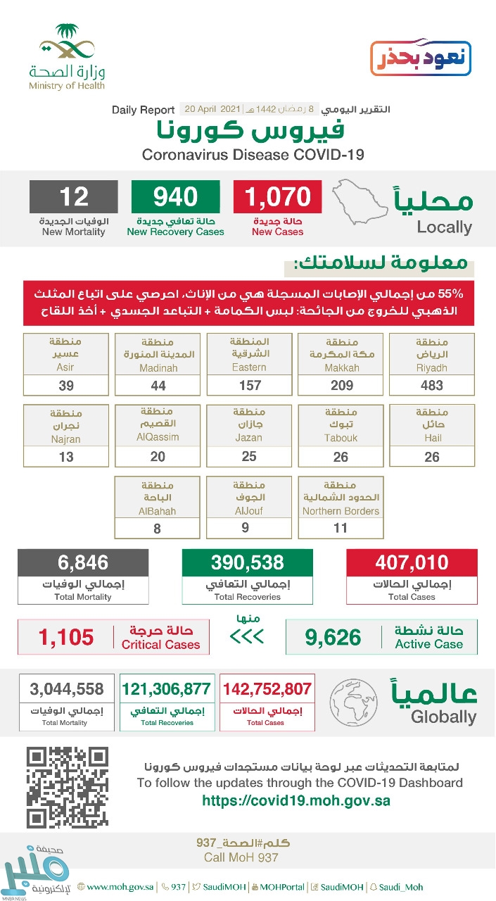 وأضافت الصحة أن إجمالي حالات المصابين في المملكة وصل إلى 407010 حالة حتى الآن ، ووصل مجموع المتعافين إلى 390538 حالة ، فيما بلغ إجمالي الوفيات 6846 حالة وفاة .