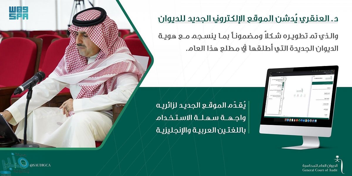 دشّن معالي رئيس الديوان العام للمحاسبة الدكتور حسام بن عبدالمحسن العنقري، اليوم الموقع الإلكتروني الجديد للديوان العام للمحاسبة، والذي تم تطويره شكلاً ومضموناً بما ينسجم مع هوية الديوان الجديدة التي أطلقها في مطلع هذا العام.