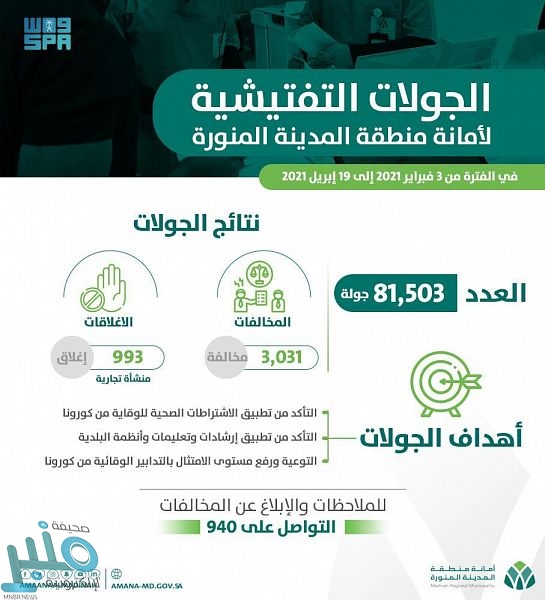 كثفت الفرق الرقابية الميدانية بأمانة منطقة المدينة المنورة جولاتها التفتيشية على المحلات والمنشآت التجارية وأسواق النفع بمختلف أنواعها للتأكد من الالتزام بالتعليمات والإرشادات البلدية وتطبيق البروتوكولات الصحية.