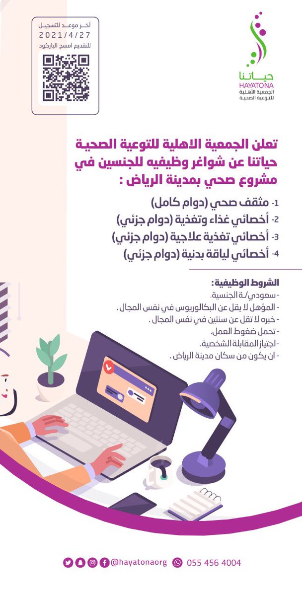 أعلنت الجمعية الأهلية للتوعية الصحية (حياتنا) توفر 4 وظائف شاغرة للجنسين بالرياض، وذلك وفقاً للتفاصيل وطريقة التقديم الموضحة أدناه.