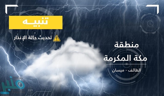 نبه المركز الوطني للأرصاد من هطول أمطار رعدية من متوسطة إلى غزيرة على الطائف وميسان اليوم، مصحوبة بنشاط في الرياح السطحية, وانعدام في الرؤية يستمر إلى الساعة الـ 10 مساءً.