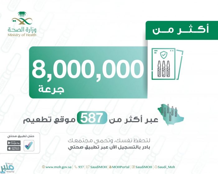 أعلنت وزارة الصحة، اليوم السبت، أن أكثر من (8,000,000) جرعة من لقاح كورونا (كوفيد-19) تم إعطائها حتى الآن عبر أكثر من (587) موقع للتطعيم في كافة مناطق المملكة.