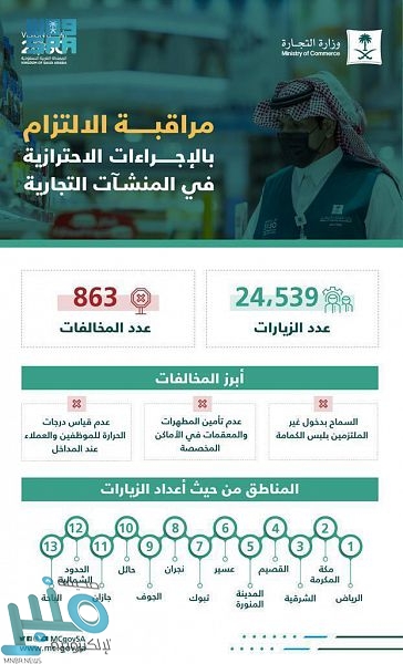 نفذت الفرق الرقابية لوزارة التجارة 24.539 زيارة تفتيشية خلال الأسبوع الماضي لمراقبة التزام المنشآت التجارية ومنافذ البيع في مناطق المملكة كافة، بتطبيق الإجراءات الاحترازية والتدابير الوقائية لمواجهة فيروس “كورونا” كوفيد 19.