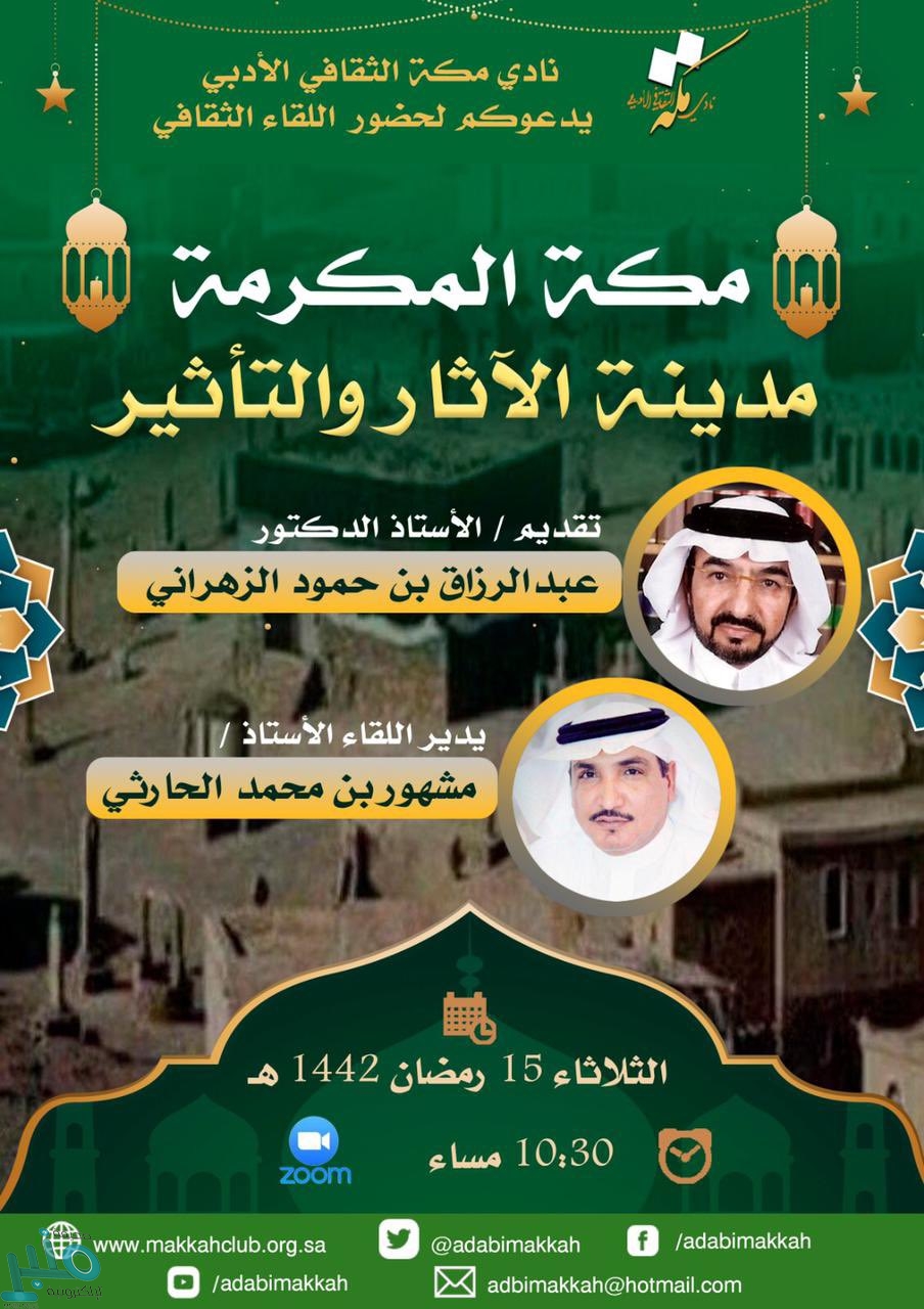 يقيم نادي مكة لقاءً ثقافيًا بعنوان “مكة المكرمة مدينة الآثار والتأثير “، ضمن موسمه الثقافي في شهر رمضان المبارك، يستضيف فيه الأستاذ الدكتور عبدالرزاق بن حمود، في تمام الساعة العاشرة والنصف مساء غدٍ الثلاثاء، عبر منصة “زووم” على الرابط التالي: