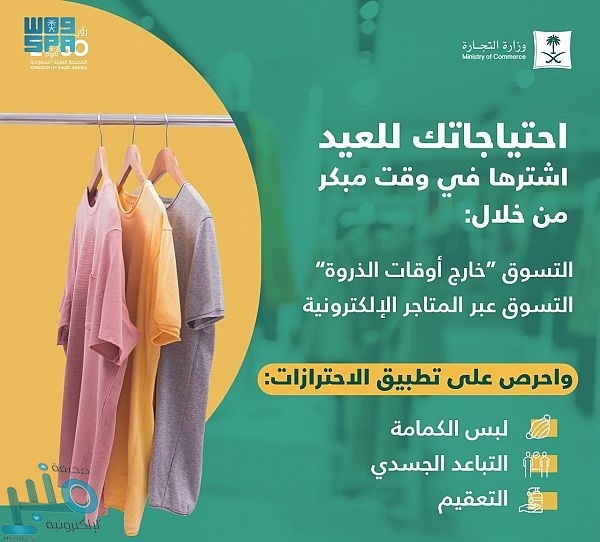 وأضافت الوزارة أن الحصول على مستلزمات العيد قبل نهاية الشهر الكريم بوقتٍ كافٍ يوفر خيارات واسعة للمستهلك، ويمكنه الاستفادة من خدمات ما بعد البيع المتمثلة في الاستبدال أو الاسترجاع وما في حكمها، موضحة أن مواسم التخفيضات متعددة ومتاحة على مدار العام، ويمكن الاستفادة منها في أي وقت وبخيارات تتناسب مع احتياجات المستهلك.