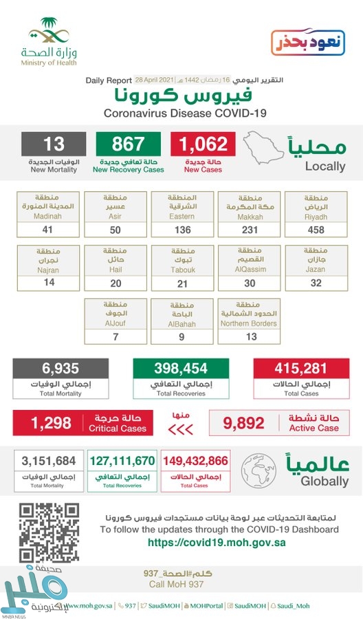 وأضافت الصحة أن إجمالي حالات المصابين في المملكة وصل إلى 415281 حالة حتى الآن ، ووصل مجموع المتعافين إلى 398454 حالة ، فيما بلغ إجمالي الوفيات 6935 حالة وفاة .