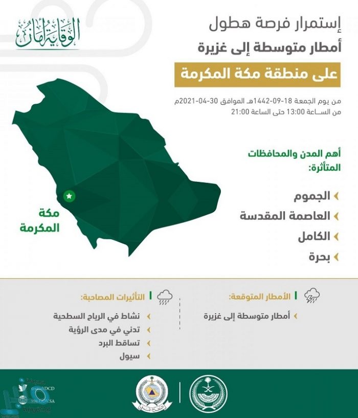 حذّرت المديرية العامة للدفاع المدني اليوم الجمعة من فرصة هطول أمطار متوسطة إلى غزيرة على عدد من محافظات منطقة مكة المكرمة