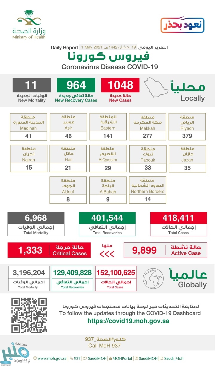 وجاء توزيع حالات الإصابة بمناطق المملكة كالتالي :