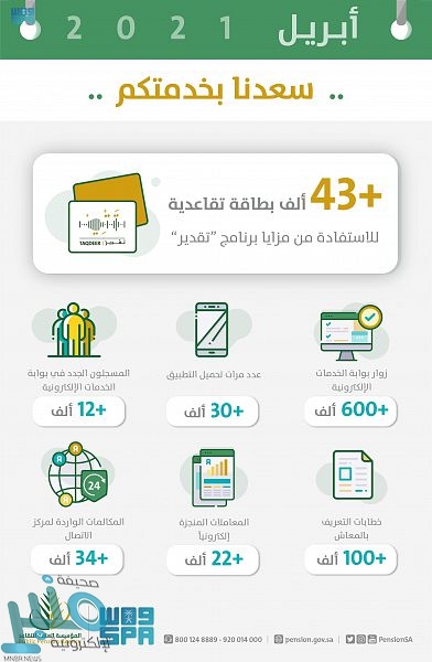 أوضحت المؤسسة العامة للتقاعد في إحصاءاتها الشهرية حول خدماتها المقدمة لعملائها عبر البوابة الإلكترونية وتطبيقها للأجهزة الذكية خلال شهر إبريل من العام 2021م عن إصدارها لأكثر من 100 ألف تعريف بالمعاش إلكترونياً من خلال قنوات الخدمات الإلكترونية وأجهزة الخدمة الذاتية، وتسجيل أكثر من 12 ألف مسجل جديد في بوابة الخدمات الإلكترونية، وأكثر من 600 ألف زائر للبوابة الإلكترونية.