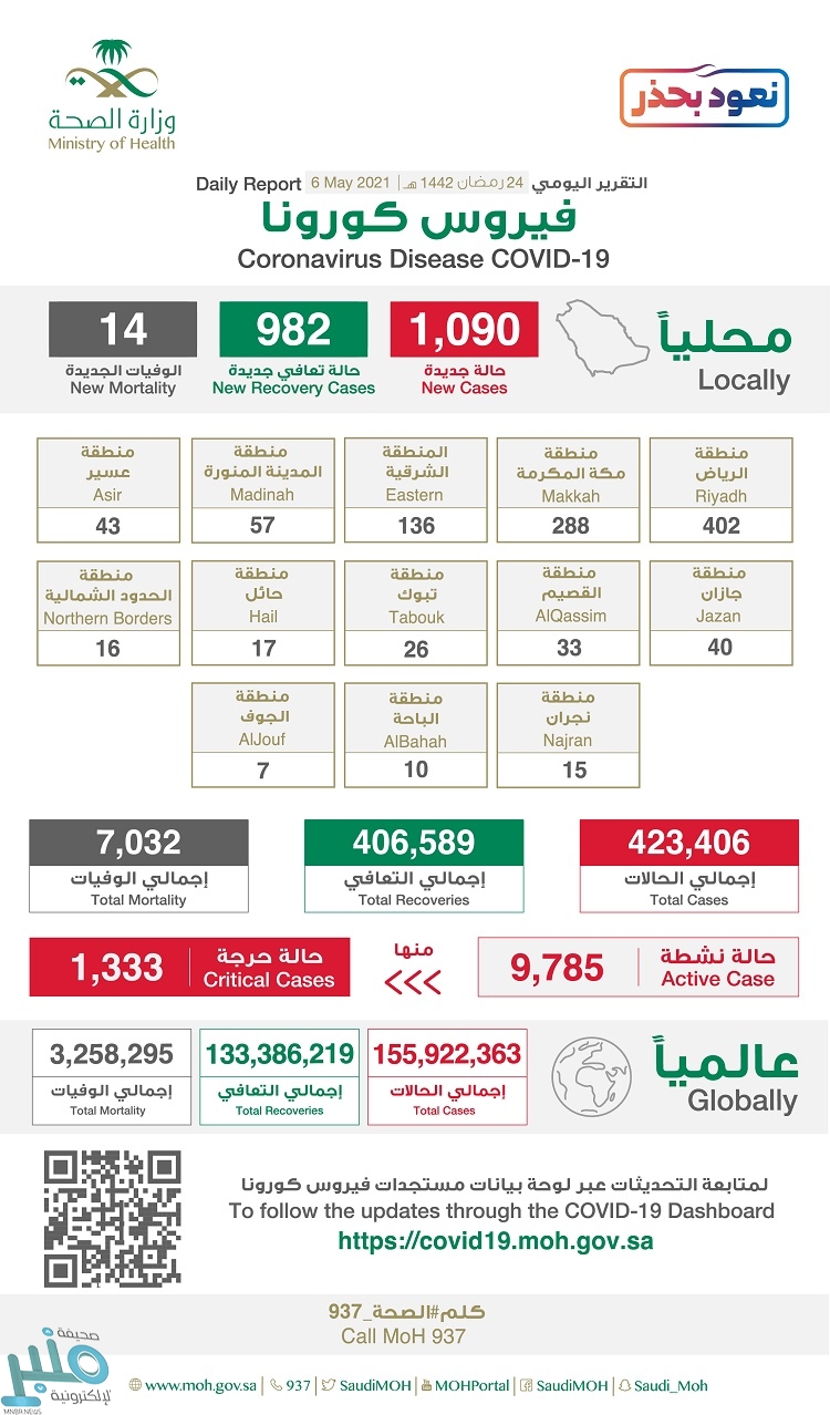 وأضافت الصحة أن إجمالي حالات المصابين في المملكة وصل إلى 423406 حالة حتى الآن ، ووصل مجموع المتعافين إلى 46589 حالة ، فيما بلغ إجمالي الوفيات 7032 حالة وفاة .