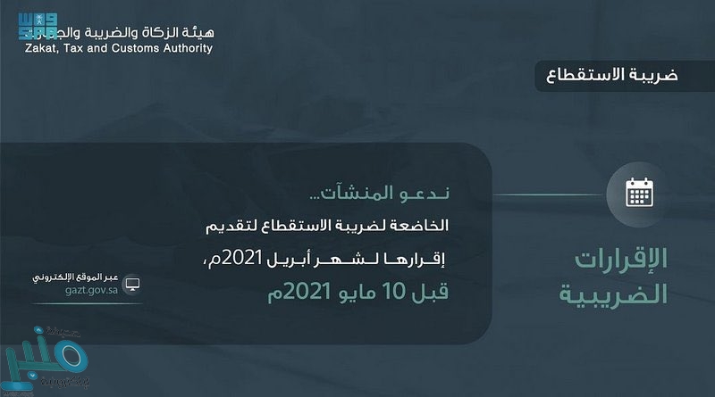 دعت هيئة الزكاة والضريبة والجمارك المكلفين الخاضعين لضريبة الاستقطاع إلى تقديم إقراراتهم الضريبية عن شهر أبريل الماضي، وذلك في موعدٍ أقصاه العاشر من شهر مايو الجاري.
