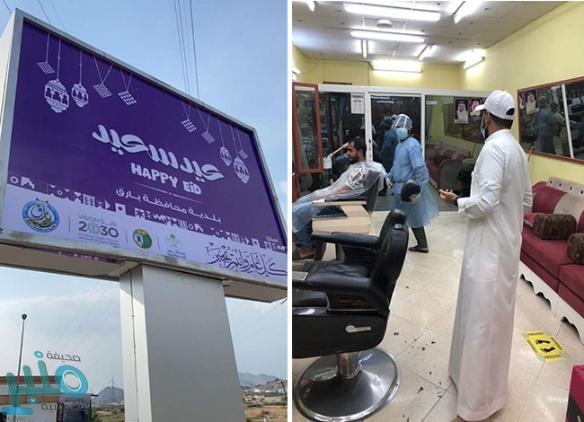 هذا وقد تم تركيب لوحات التهنئة بالعيد وتزيين بعض المواقع بإضاءة الزينة كما قام مراقبي الأسواق بجولات رقابية على المحلات المهنية للتأكد من تطبيق كافة الإجراءات الاحترازية وعدم حدوث الازدحام وتم رصد بعض المخالفات واُتخذت الإجراءات النظامية حيالها.