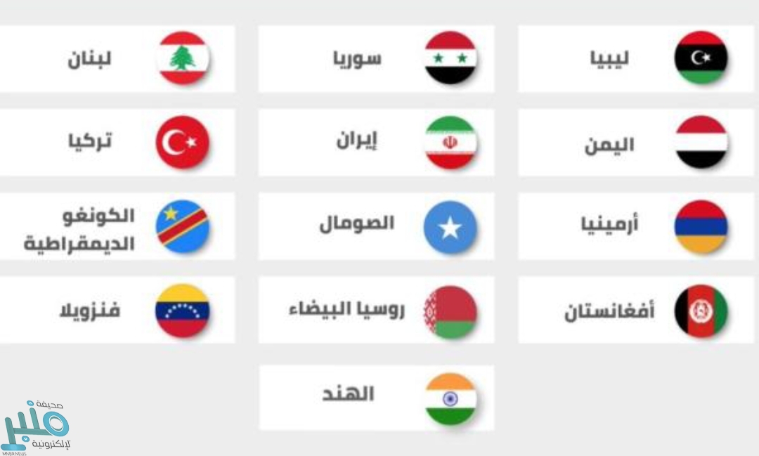 صرّح مصدر مسؤول في وزارة الداخلية بأنه إلحاقاً للبيان الصادر بتاريخ 29 جمادى الأولى 1442هـ الموافق 13 يناير 2021م بشأن التحذير من السفر إلى عدد من الدول، وحرصاً من المملكة على سلامة وأمن المواطنين الراغبين في السفر إلى الخارج عند حلول موعد السماح به اعتباراً من الساعة الواحدة صباحاً من يوم الاثنين 5 / 10 / 1442هـ الموافق 17 / 5 / 2021م، وفي ظل الظروف الأمنية وحالة عدم الاستقرار السائدة في عدد من الدول، واستمرار تفشي جائحة كورونا ( كوفيد ـ 19 ) وانتشار سلالة جديدة متحورة من الفيروس ، تؤكد وزارة الداخلية على المواطنين استمرار منع السفر، سواءً مباشرة أو عن طريق دولة أخرى، إلى الدول التالية دون الحصول على إذن مسبق من الجهات المعنية، وهي : ( ليبيا، سوريا، لبنان، اليمن، إيران، تركيا، أرمينيا، الصومال، الكونغو الديمقراطية، أفغانستان، فنزويلا، روسيا البيضاء، الهند ) ، وأي دول أخرى لم يتم بعد السيطرة على الجائحة فيها أو ثبت انتشار السلالة المتحورة من الفيروس فيها.
