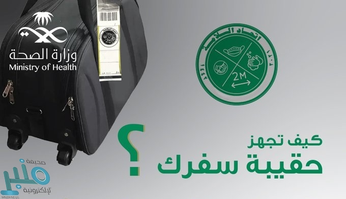 ونصحت الوازرة عبر حسابها “عش بصحة” على تويتر باحتواء حقيبة السفر على (معقم كحولي، وكمامات إضافية، ووجبات خفيفة، وأدوات طعام ذات الاستخدام الواحد، فضلا عن تجهيز أدوات شخصية خاصة مثل مخدة أو مسند رقبة أو بطانية).