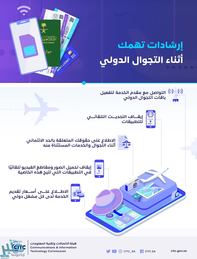 دعت هيئة الاتصالات وتقنية المعلومات، المسافرين للتواصل مع مقدم الخدمة قبل السفر خارج المملكة للتعرف على الخدمات والباقات المتعلقة بالتجوال الدولي واختيار الأنسب منها، وذلك ضمن مجموعةٍ من النصائح والإرشادات التي وجهتها الهيئة للمسافرين تزامنًا مع صدور الموافقة على رفع القيود عن سفر المواطنين إلى خارج المملكة والعودة إليها، وفتح المنافذ البرية والبحرية والجوية.