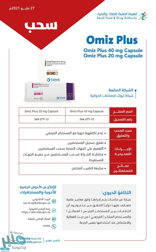 أعلنت الهيئة العامة للغذاء والدواء، اليوم (الخميس)، سحب وتعليق تسجيل كبسولات “أوميز بلس 40 م”، وكبسولات “أوميز بلس 20 م”، لعدم تكافئهما حيويًا مع المستحضر المرجعي.