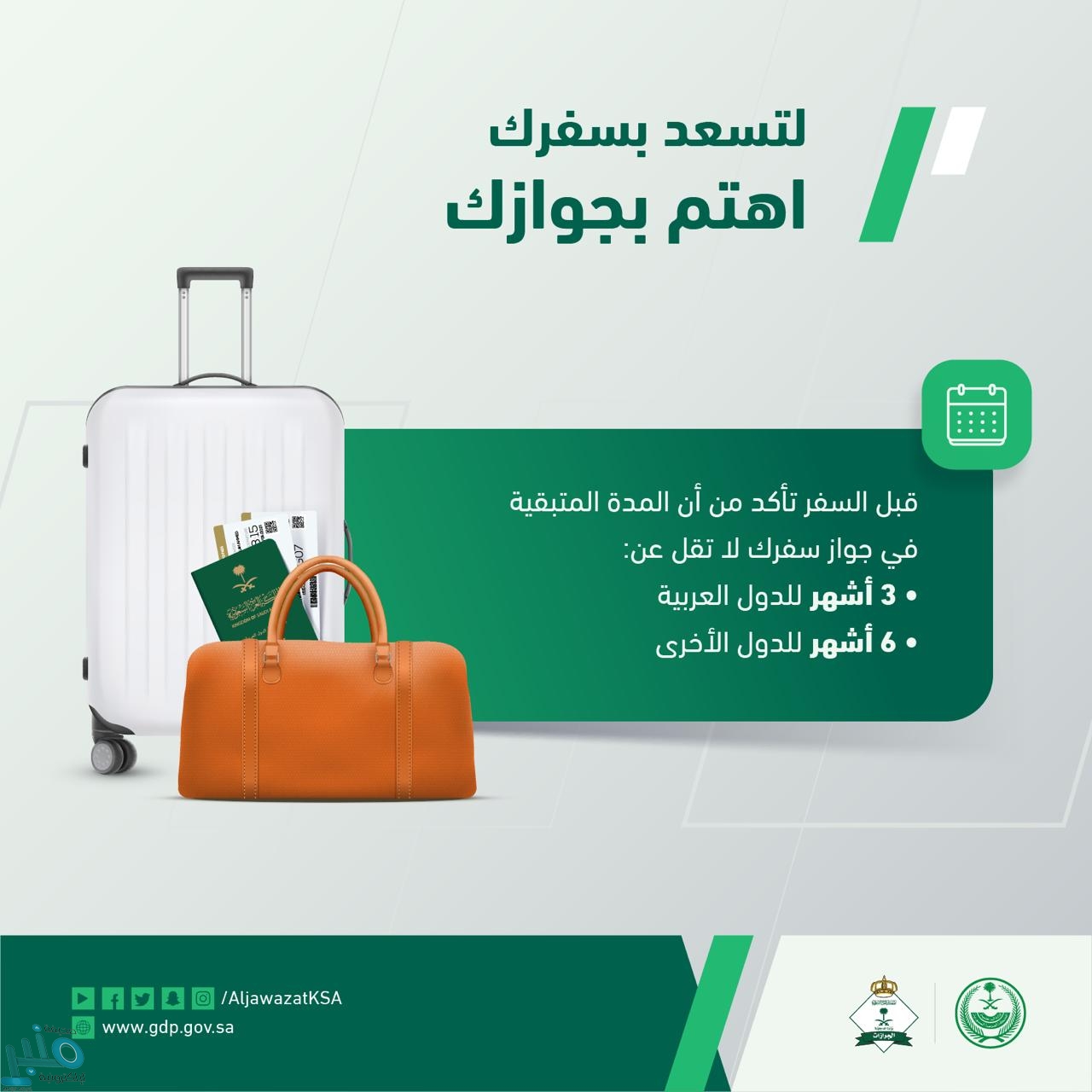 وقال حساب الجوازات عبر “تويتر”: “قبل السفر تأكد من أن المدة المتبقية في جواز سفرك لا تقل عن 3 أشهر للدول العربية و 6 أشهر للدول الأخرى”.
