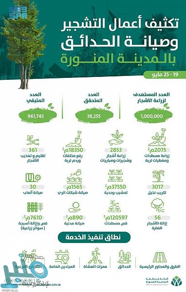 وكانت الأمانة قد نجحت في زراعة 38 ألفا و255 شجرة ضمن مبادرتها التي تستهدف الوصول إلى مليون شجرة، كما عمدت لزراعة عدد من المسطحات وتحويلها إلى مناطق خضراء بمساحة تبلغ 2075 مترا مربعا.