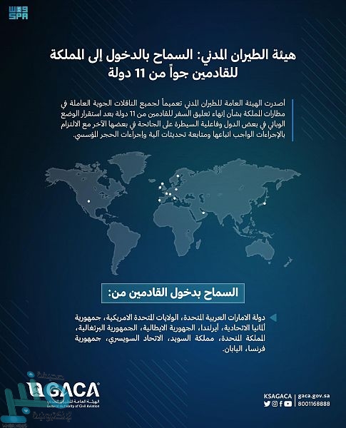 وينص التعميم على السماح بدخول المملكة للقادمين عبر المنافذ الجوية وإنهاء تعليق السفر للقادمين من الدول التالية: (دولة الإمارات العربية المتحدة، والولايات المتحدة الأمريكية، وجمهورية ألمانيا الاتحادية، وأيرلندا، والجهورية الإيطالية، والجمهورية البرتغالية، والمملكة المتحدة، ومملكة السويد، والاتحاد السويسري، وجمهورية فرنسا، واليابان)، وذلك إثر إعلان الجهات المختصة بناء على ما عرضته الجهات الصحية بشأن استقرار الوضع الوبائي في عدد من الدول المعلنة، وفاعلية السيطرة على الجائحة في بعض هذه الدول.