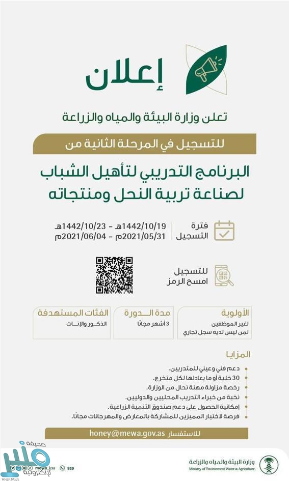 أعلنت وزارة البيئة والمياه والزراعة بدء التسجيل في المرحلة الثانية من البرنامج التدريبي لتأهيل الشباب لصناعة تربية النحل ومنتجاته.