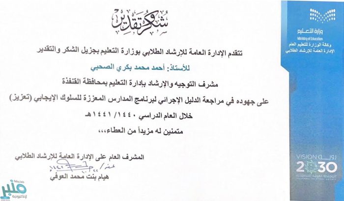 تلقى الأستاذ أحمد بن محمد الصحبي مشرف التوجيه والإرشاد في مكتب التعليم بحلي التابع لتعليم القنفذة خطاب شكر وتقدير من وزارة التعليم، وذلك تقديرًا لجهوده في مراجعه الدليل الإجرائي لبرنامج المدارس المعززة للسلوك الإيجابي “تعزيز”.
