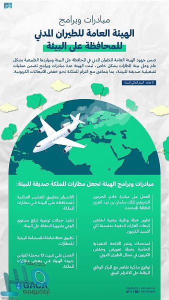 استعرضت الهيئة العامة للطيران المدني أبرز مبادراتها المتعلقة بالبيئة، وذلك تزامنًا مع اليوم العالمي للبيئة، الذي يوافق 5 يونيو من كل عام، استشعاراً منها بأهمية هذاالحدث العالمي والإسهام في المحافظة على البيئة ومواردها الطبيعية بشكال عام وعلى بيئة المطارات بشكل خاص من خلال خطط للاستدامة البيئية والحد من الانبعاثات الكربونية.