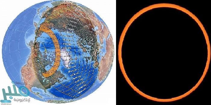 وأبان أن الراصدين سيتمكنون في المناطق الواقعة في مسار الكسوف الحلقي الضيق في أقصى شرق روسيا والمحيط المتجمد الشمالي وغرب غرينلاند وكندا وروسيا من رؤية وقوع القمر مباشرة أمام الشمس, ولكن لن يغطيها بالكامل لأن القمر سيكون بعيداً عن الأرض و حجمه الظاهري لن يكون كبيراً كفاية، لذلك ستبقى حلقة مضيئة حول القمر تسمى “حلقة الضوء” ، ما يعني أن هالة الشمس لن تكون مرئية.