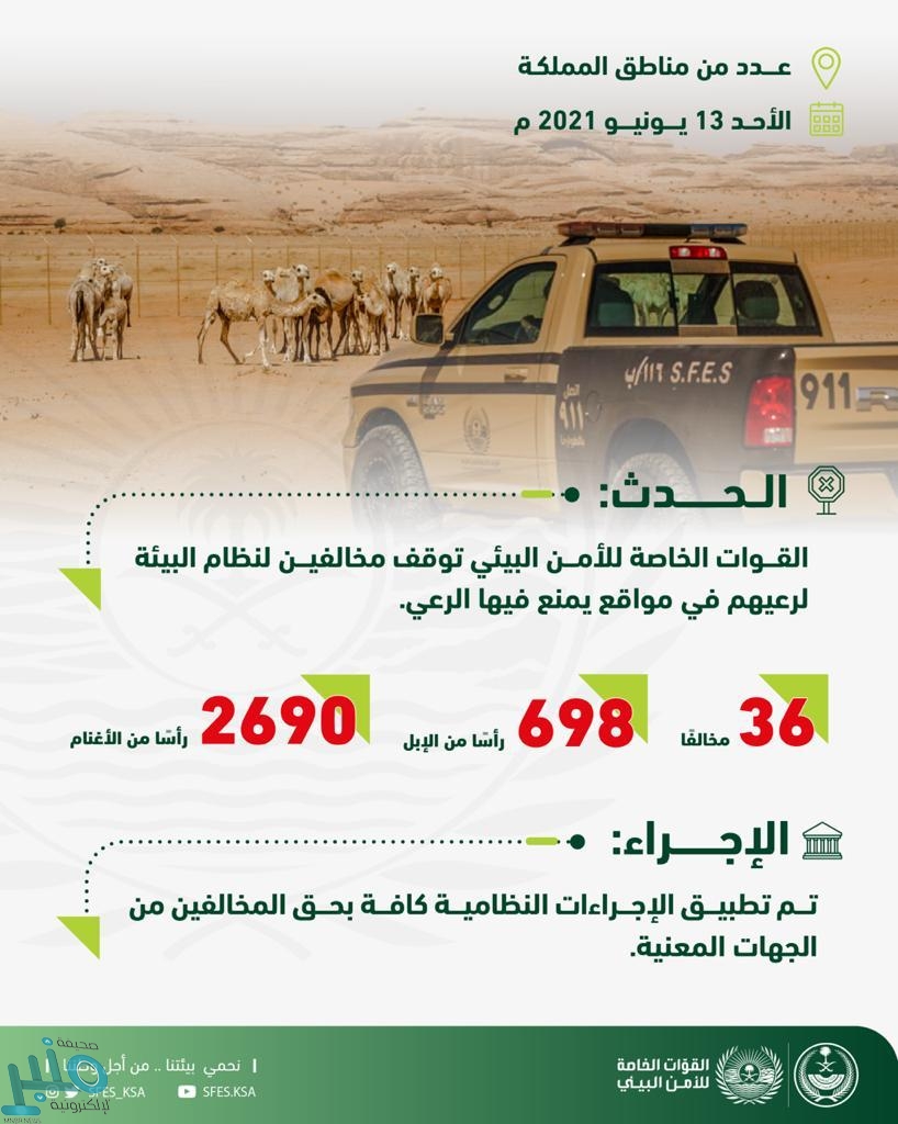 أوقفت القوات الخاصة للأمن البيئي (36) مخالفًا لنظام البيئة، منهم (18) مواطنًا و (18) مقيمًا، من الجنسيتين السودانية والصومالية، ارتكبوا مخالفات رعي (698) رأسًا من الإبل و (2690) رأسًا من الأغنام في أماكن يمنع فيها الرعي في عدد من مناطق المملكة.