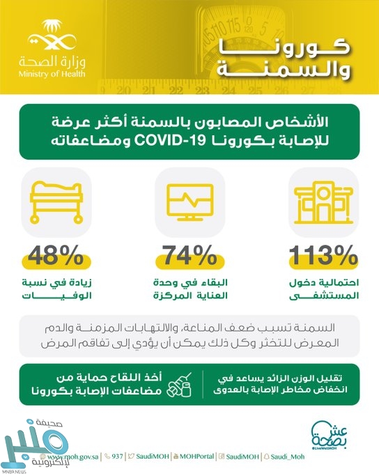 ونشرت “الصحة” عبر حسابها في تويتر ومنصتها التوعوية “عش بصحة” إنفوجرافيك للتعريف بمخاطر السمنة والأمراض المصاحبة جراء الإصابة بهذا المرض، مبينةً أن السمنة تسبب ضعف المناعة والالتهابات المزمنة والدم المعرض للتخثر يمكن أن تؤدي – لا سمح الله – إلى تفاقم المرض.