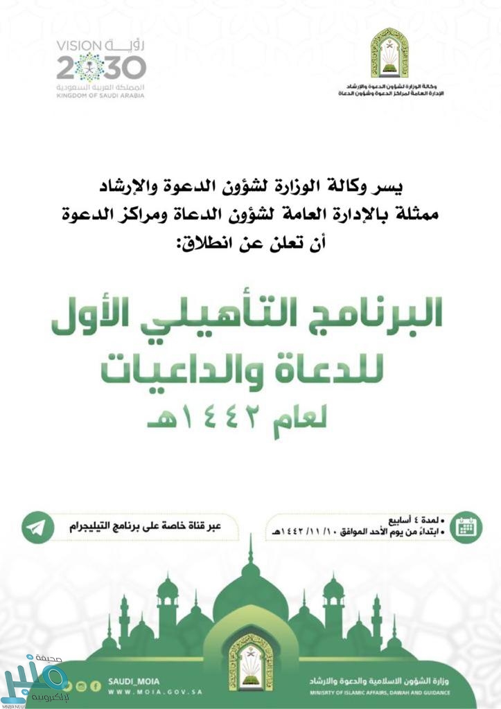 تطلق وزارة الشؤون الإسلامية والدعوة والإرشاد ممثلة بوكالتها للدعوة والإرشاد البرنامج التأهيلي الأول للدعاة والدعيات الجدد، والذي يستمر لمدة أربعة أسابيع بدءًا من يوم غد الأحد، بمحاضرات ودورات علمية مكثفة عبر البث المباشر، يقدمها نخبة من المختصين بالأمن الفكري والدعوة وأساليبها.