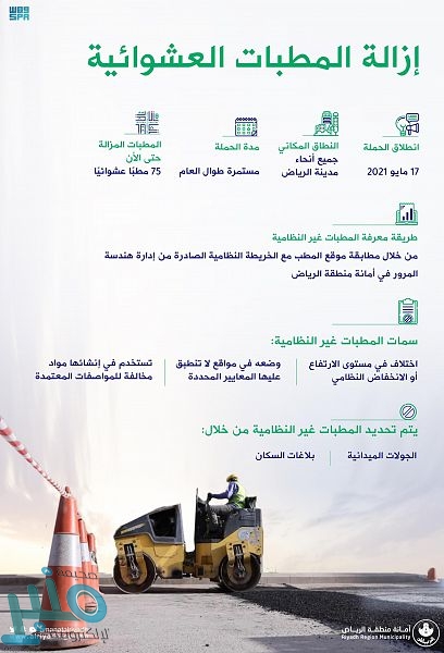 وبيّنت أمانة الرياض أن حملتها المكثفة مستمرة طوال العام، مشددة على ضرورة تقيّد الجميع بالأنظمة والتعليمات، وعدم استحداث أي مطبّات عشوائية من شأنها إعاقة سير المركبات والإضرار بها، والتأثير المباشر على جودة وكفاءة الطرق التي يتم تُنفَّذ وفق مواصفات ومعايير محددة.