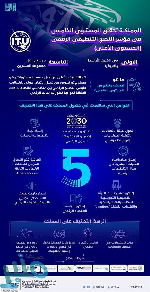 أعلن الاتحاد الدولي للاتصالات عن تصنيف المملكة في أعلى مستويات “مؤشر النضج التنظيمي الرقمي” لمنظمي الاتصالات حول العالم “المستوى الخامس”، عقب نجاحها في بناء إطار تنظيمي مستدام ومتجانس والتحول نحو التنظيم التعاوني، لتكون في المرتبة الأولى بالشرق الأوسط وإفريقيا، وفي المرتبة التاسعة بين دول مجموعة العشرين.