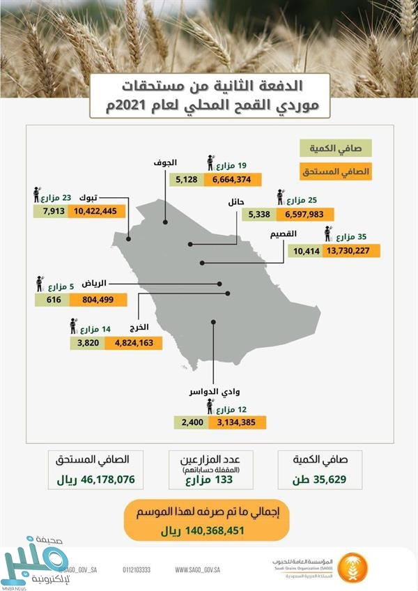 يذكر أن المؤسسة بدأت في تسلم القمح المحلي من المزارعين للموسم الحالي اعتباراً من 22 شعبان الماضي، مشددة على المزارعين بإقفال حساباتهم فور الانتهاء من تسليم الكميات المخصصة لهم؛ ليتسنى إيداع الدفعات التالية بحسب الكميات الموردة وبعد استكمال إجراءات التدقيق.