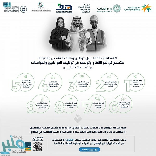 ويمكن لمنشآت التشغيل والصيانة، الاطلاع على دليل التوطين، عبر الرابط التالي: https://hrsd.gov.sa/sites/default/files/83956_0.pdf، كما يمكنها الإعلان عن وظائف القطاع عبر البوابة الوطنية للعمل “طاقات”، من خلال الرابط: www.taqat.sa.