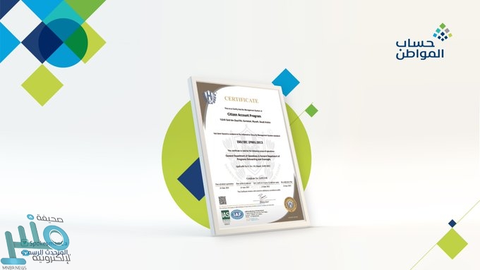 حصل برنامج حساب المواطن على شهادة الأيزو 2013: 27001 ISO لنظام إدارة حماية المعلومات المعتمد من قبل حلول الإدارة الخطية (LMS) والمعتمدة من خدمات الاعتماد الدولي (IAS)ويعتبر هذا الاعتماد معيار معترف به دوليًا يضمن تلبية احتياجات المستفيدين من خلال نظام فعال لإدارة وحماية المعلومات الخاصة بهم من خلال ضمان جودة التعامل مع البيانات.