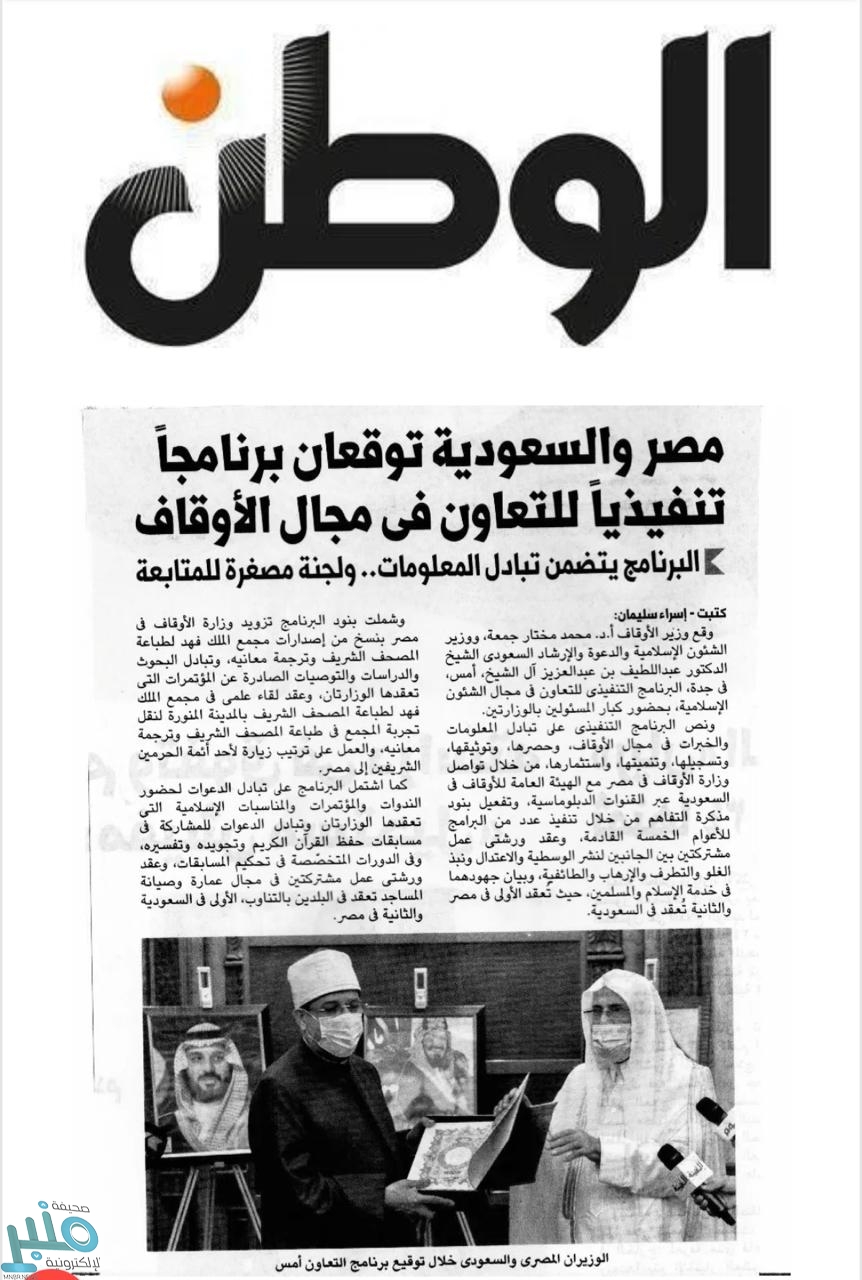 وتطرقت صحيفة الوطن المصرية تحت عنوان “مصر والسعودية توقعان برنامجا تنفيذيا للتعاون في مجال الاوقاف”، إلي أن البرنامج التنفيذي نص على تبادل المعلومات والخبرات في مجال الأوقاف، وحصرها، وتوثيقها، وتسجيلها، وتنميتها، واستثمارها، من خلال تواصل وزارة الأوقاف في مصر مع الهيئة العامة للأوقاف في المملكة العربية السعودية عبر القنوات الدبلوماسية بحكم الاختصاص، وتفعيل بنود مذكرة التفاهم من خلال تنفيذ عدد من البرامج للأعوام الخمسة القادمة، وعقد ورشتي عمل مشتركة بين الجانبين لنشر الوسطية والاعتدال ونبذ الغلو والتطرف والإرهاب والطائفية، وبيان جهودهما في خدمة الإسلام والمسلمين، حيث تُعقد الأولى في مصر والثانية تُعقد في المملكة العربية السعودية.