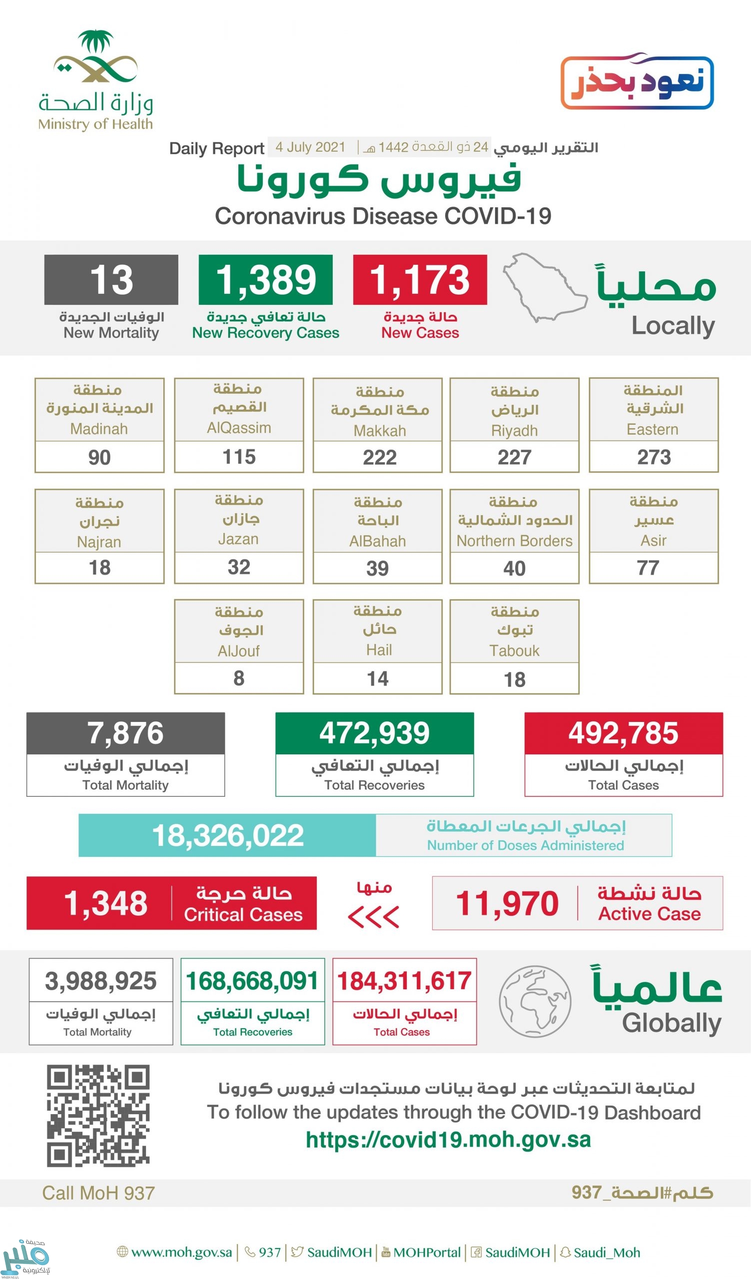 وأضافت الصحة أن إجمالي حالات المصابين في المملكة وصل إلى 492785 حالة حتى الآن ، ووصل مجموع المتعافين إلى 472939 حالة ، فيما بلغ إجمالي الوفيات 7876 حالة وفاة .